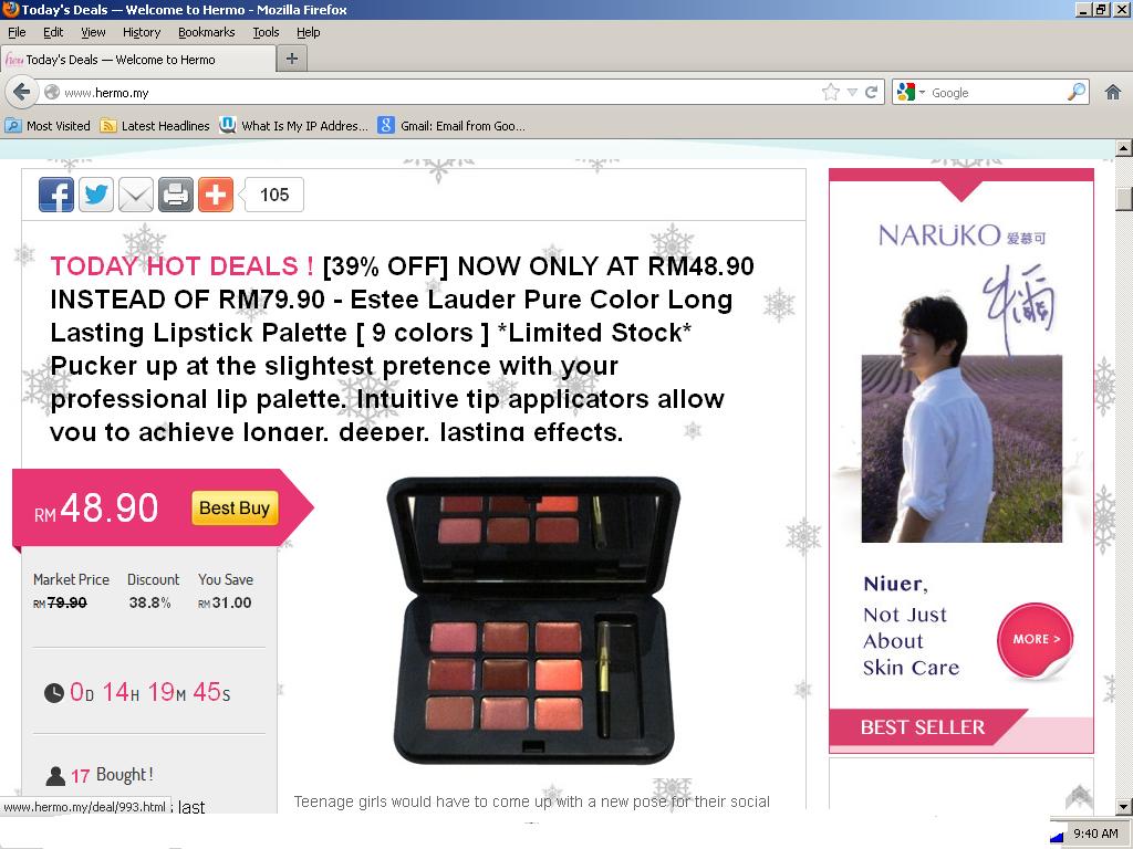 www.hermo.com was my recent great discovery of online buying site which provide branded cosmetic and skin care product such as Estee Lauder, Laneíge, SK-II, Elizabeth Arden and etc with reductions of up to 20%- 40% off the market price!