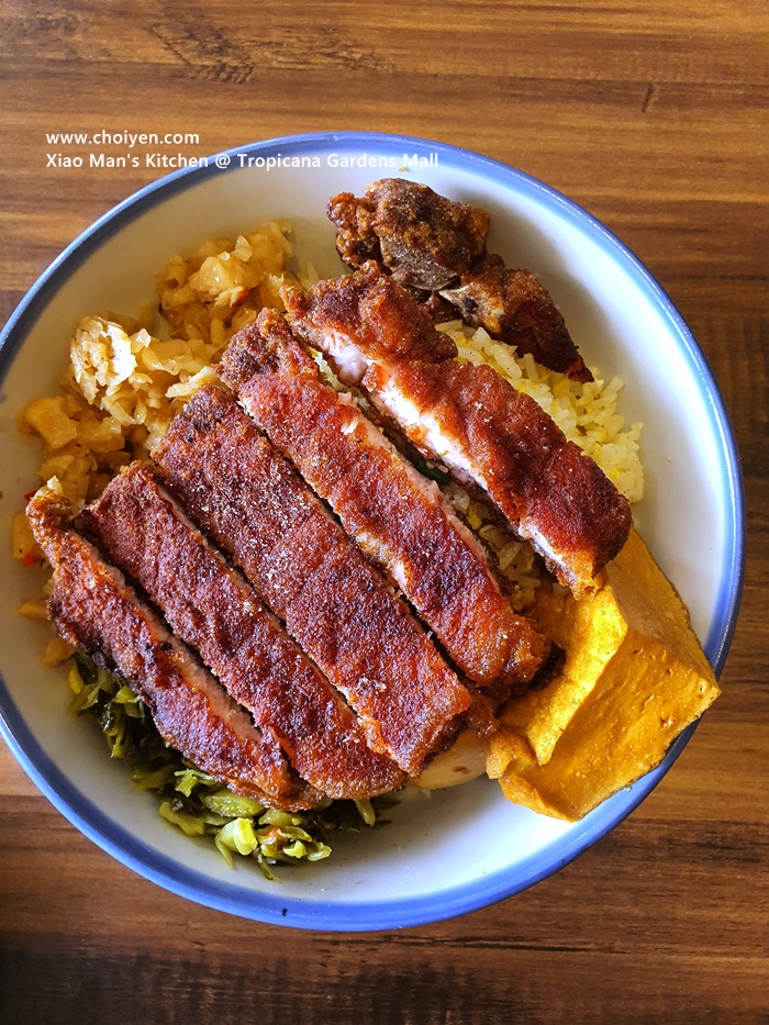 The presentation was attractive with big slab of fried to perfect golden pork chop, pickles, preserved radish, braised tofu and egg (underneath the pork chop), arranged nicely on the bowl of egg fried rice.