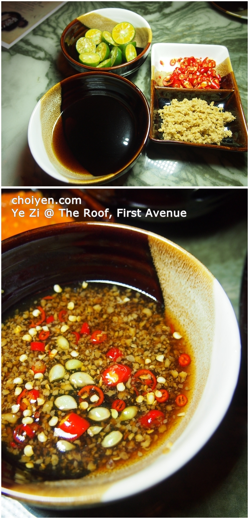 Follow the guidance provided to mix the Yezi special homemade dipping sauce which consisted of  superior soy sauce, chili, sand ginger and lime.