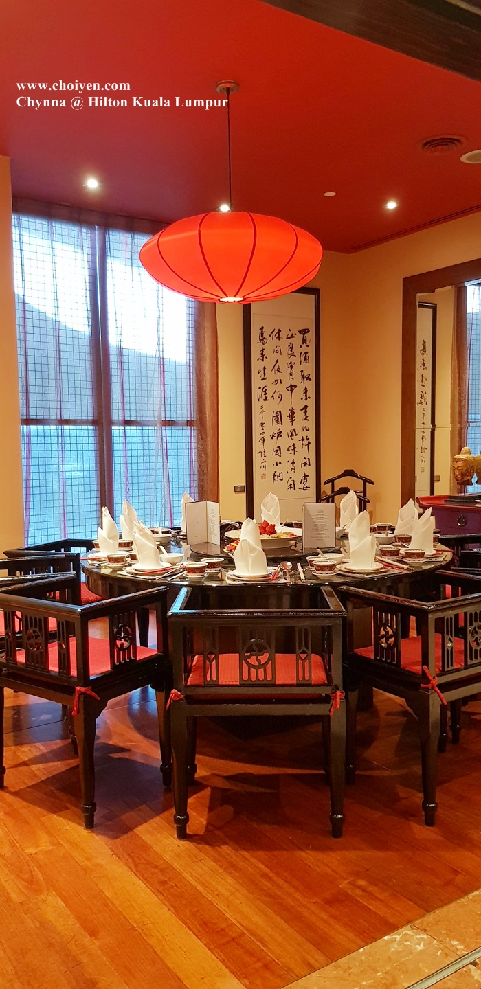Chynna Chinese restaurant located on 5th Floor of Hilton Kuala Lumpur is gorgeously set in grandeur. Opulence with an Oriental theme, the spacious restaurant featuring a traditional Chinese herbal cabinet near the entrance, the main dining area, an open dim sum kitchen and private room. High ceilings with hanging red lanterns with different shapes, antique rosewood and red draped chairs, beautiful ornamental artifacts, and sheer blinds in ancient Chinese art motifs, that complements and adds to the opulence of the theme.