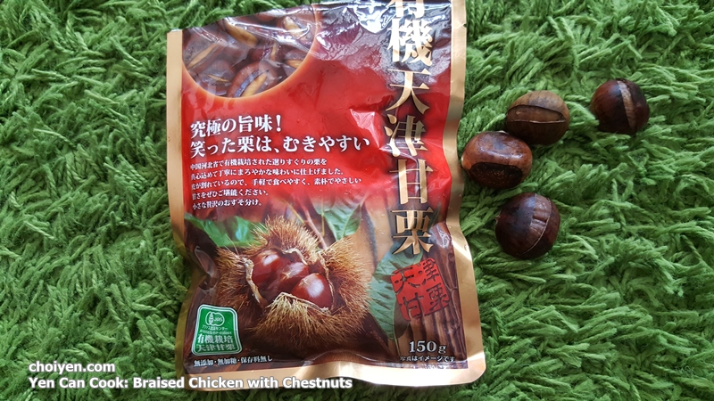 Do you like chestnuts(栗子/板栗)? I like it very much, be it roasted, boiled or braised in a dish. I like its delicate creamy texture and the sweet nutty flavour. Chestnuts are available fresh, dried, frozen as well as cooked and ready-to-eat package just like the photo shown below.