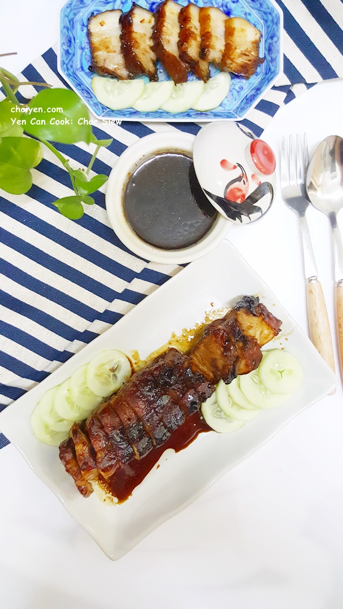 Char Siew, is a Cantonese delicacy of roasted marinated pork belly over charcoal fire. The meat is then sliced and served often with rice or noodles. But do you know that Char Siew can be done with a non-roast/bake method which is essentially cooking it down on a stovetop, in a normal pan. This rendition is really very simple, akin to making a stew. If you don’t particularly like those charred black bits on the baked char siew, this is perfect for you.