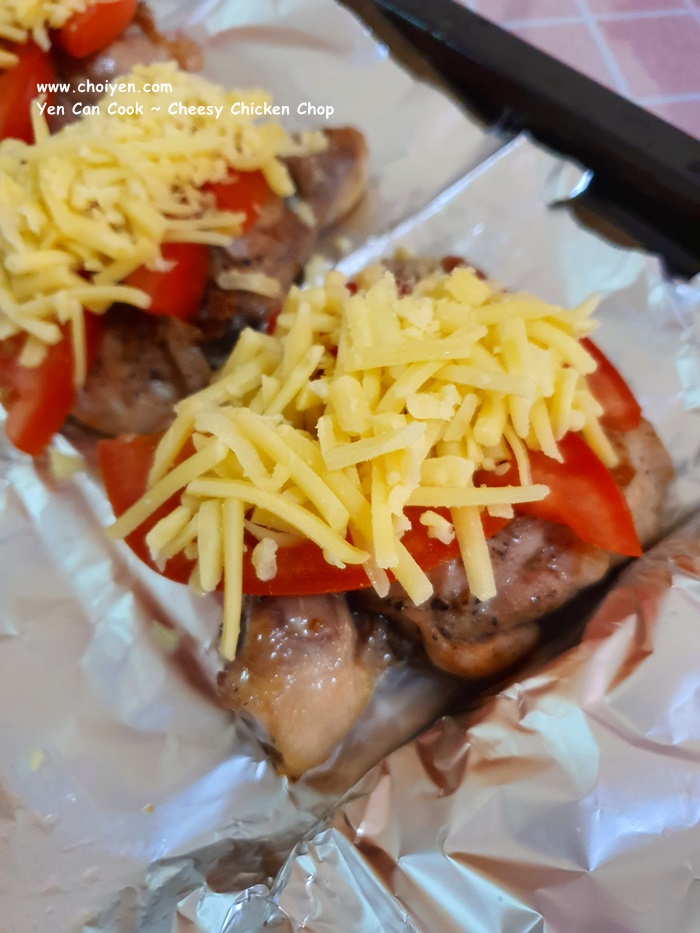 Step 5: Preheat oven at 220°C. Baked the chicken chop (Step 4) for 12 minutes or until the cheese has melted and browned.