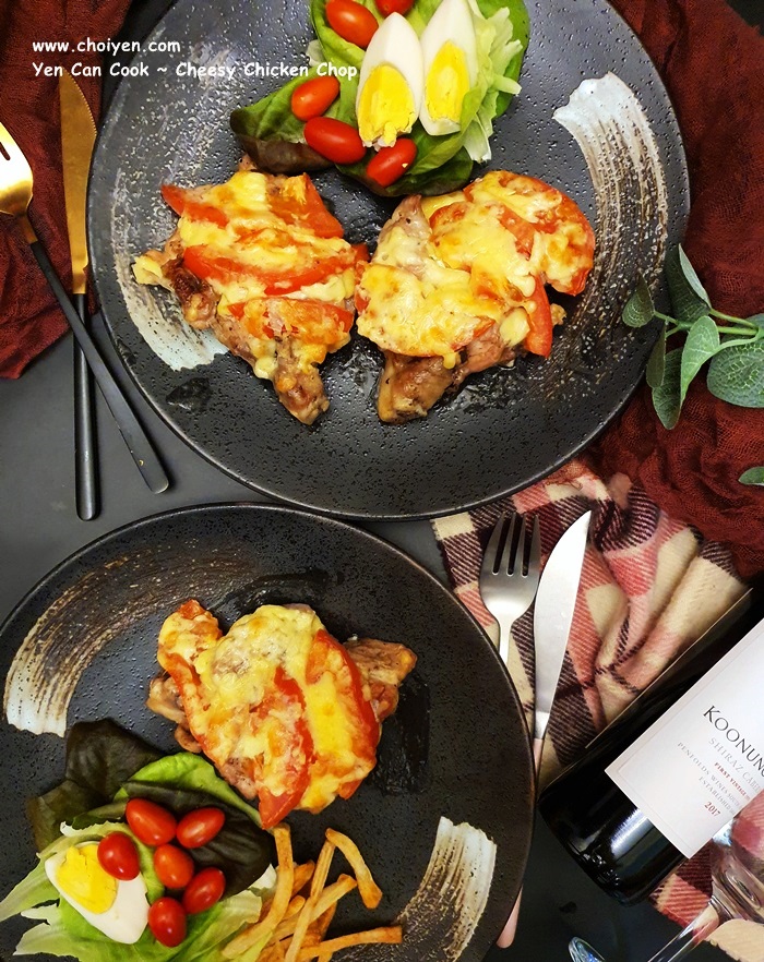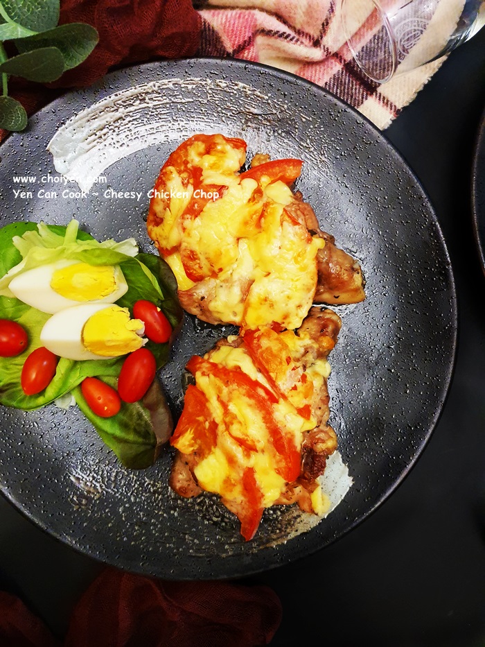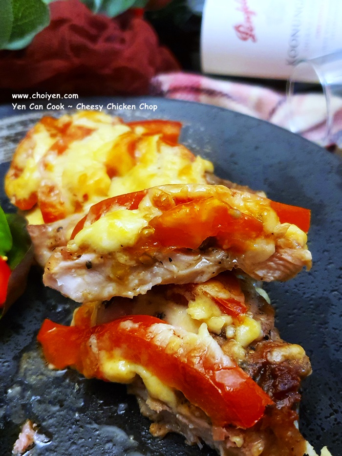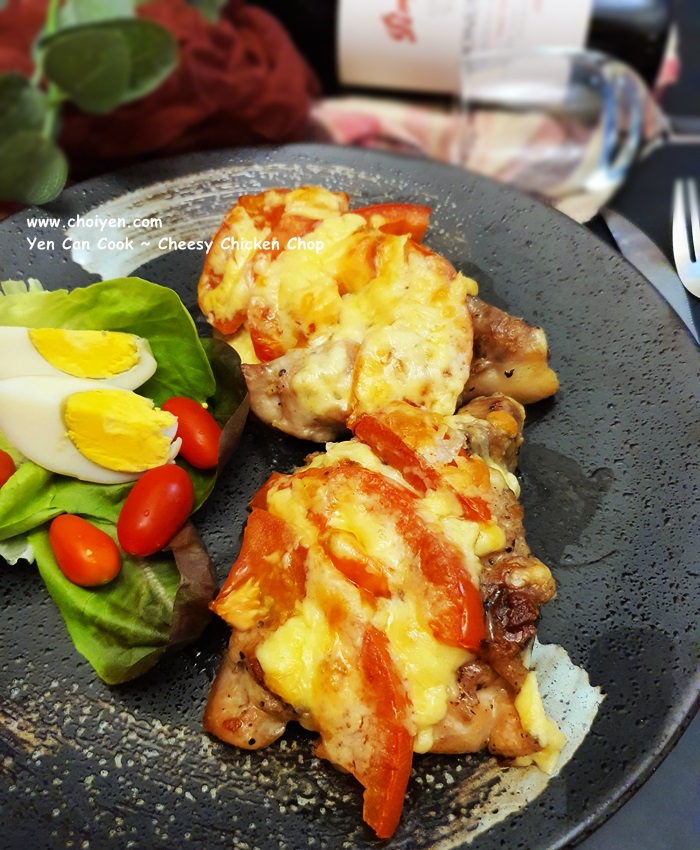 To make your Friday night dinner even more fuss-free, bake your chicken chops in the oven for 20 – 25 mins (less one pan to wash…kekeke) and put in the tomatoes and cheese in the last 10 mins of your cook…and they’ll be just the same as what you’ve done here. ^_~ I love baked chicken chops too for minimal cooking and washing…lol.