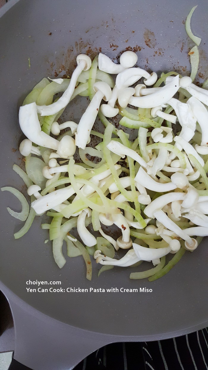 Step 5: In the same skillet, stir fry the sliced yellow onions until soften then add in Shimeji mushroom and continue stir fry for 1-2 minutes.