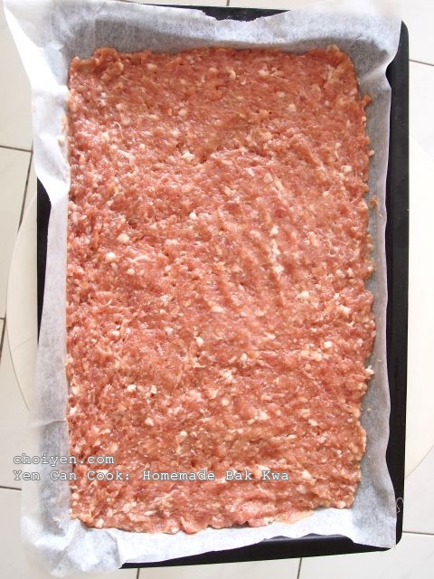 Step 2: Line the baking tray with baking paper then spread marinated minced pork thinly onto the baking tray using fingers.
