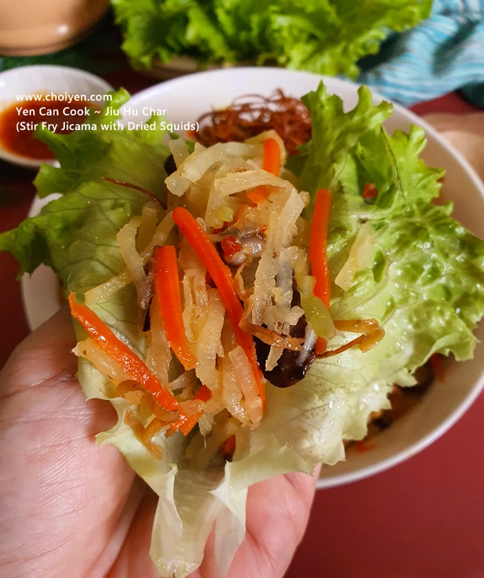 Jiu Hu Char or “bang kuang char” is one of the favourite dishes in Peranakan households especially in Penang. It is an old time flavour dish of stir fried julienned jicama/yam bean and assorted vegetables with cuttlefish floss which is always being served during festival celebration or ancestral praying. This dish is usually eaten wrapped like a parcel with fresh lettuce leaves.