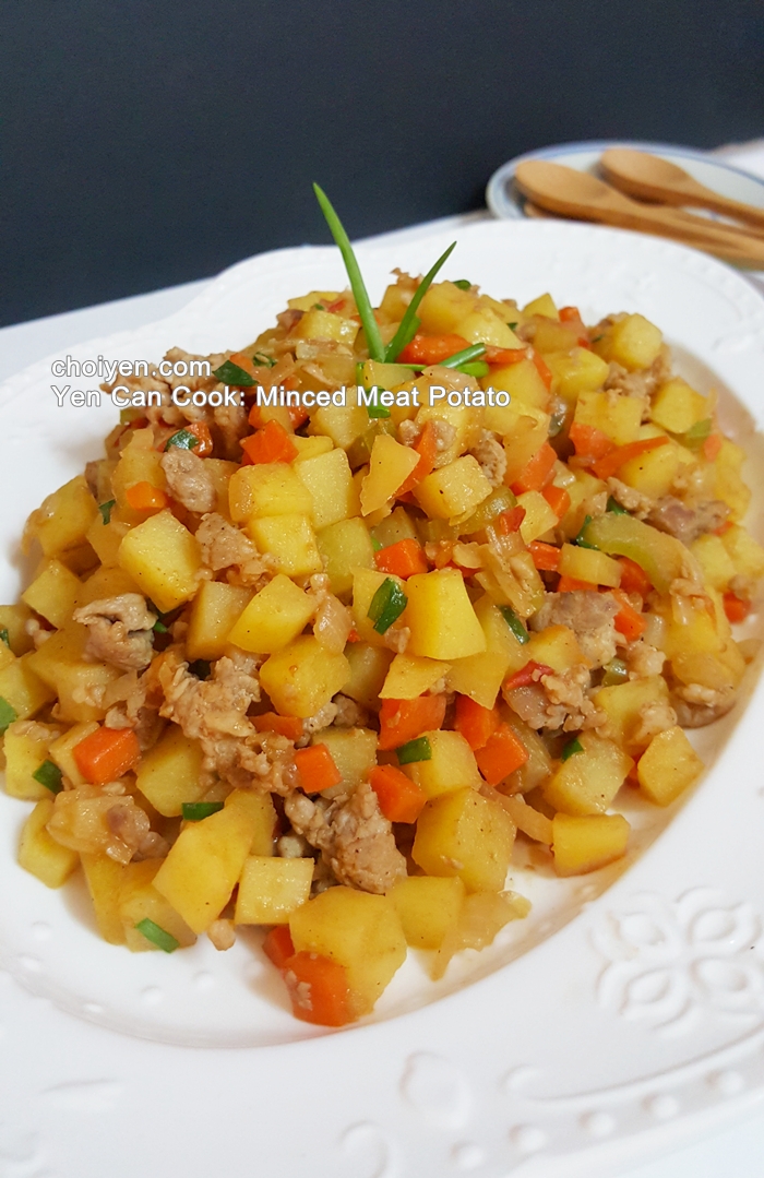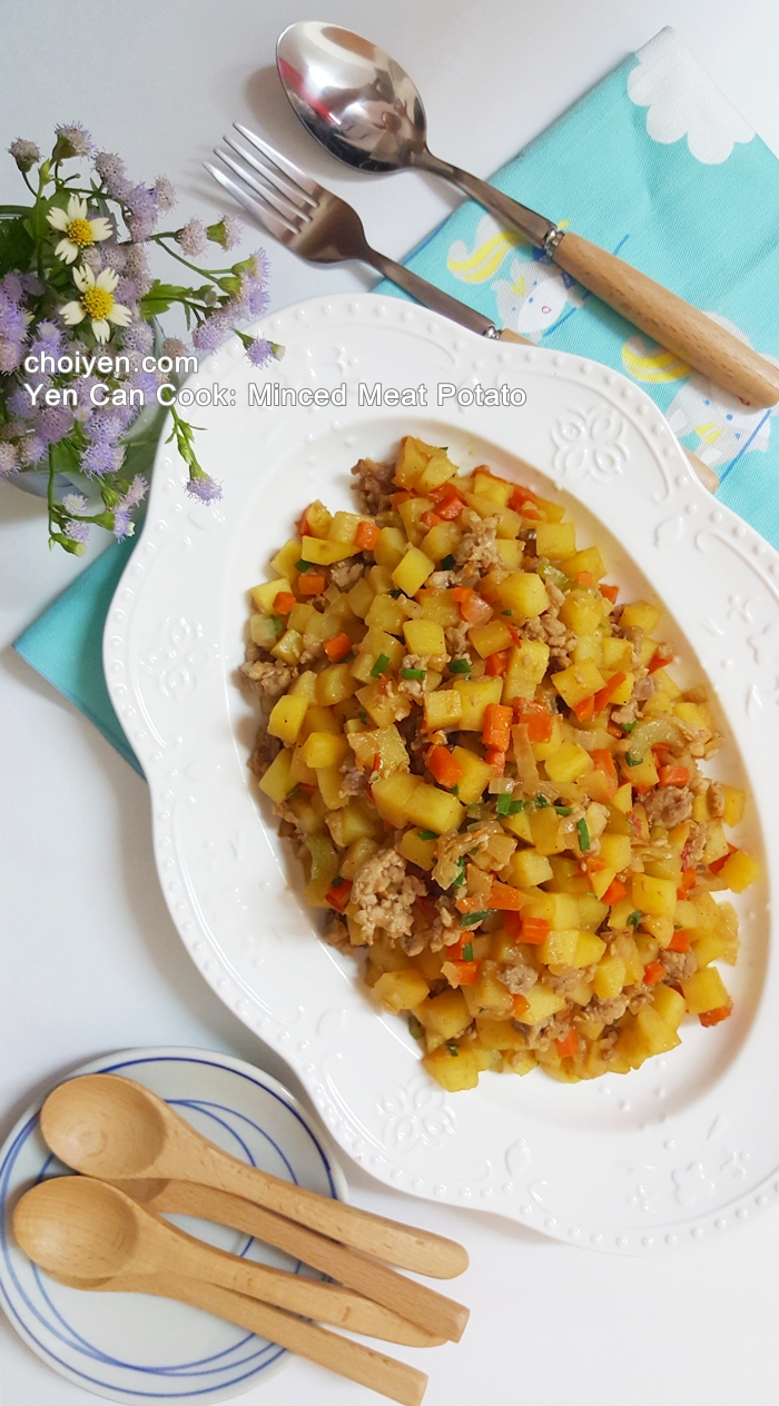 Step 5: Add the potato (Step 2), followed by sugar, soy sauce, Chinese cooking wine and pepper. Stir to coat all the ingredients. Pour in water, cover with lid and simmer, stirring occasionally, for 5-10 minutes or until the diced carrots are soften.