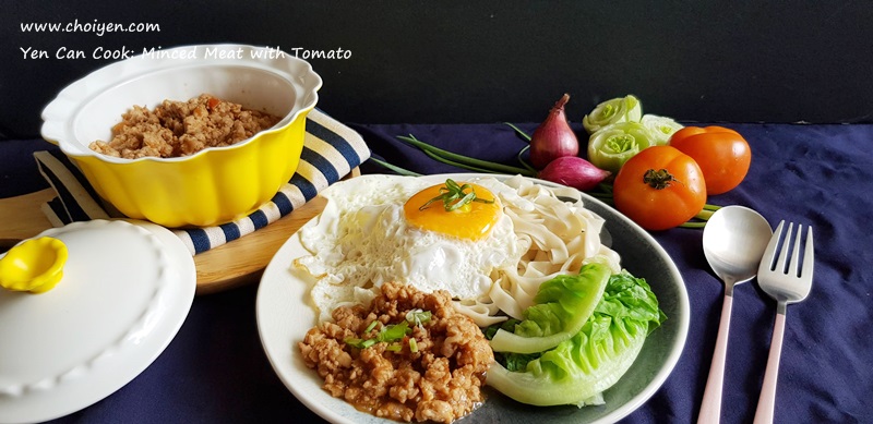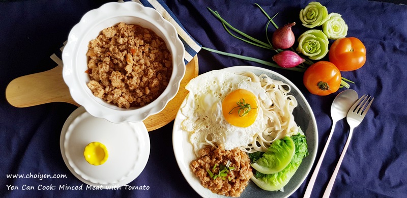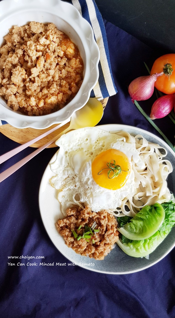 Like everyone else, there are more days than I would like to admit where I was too tired to be bothered to cook after a hectic day at work. And on these days, I fall back to recipes that are simple and comforting, this braised minced pork with tomato is one of those recipes that I like to prepare. The dish is easy and so delicious served on rice or noodles. I’ll also cook in big batch to keep it in freezer, and it’s definitely your savior when lazy bugs bite or you run out of idea what to cook.