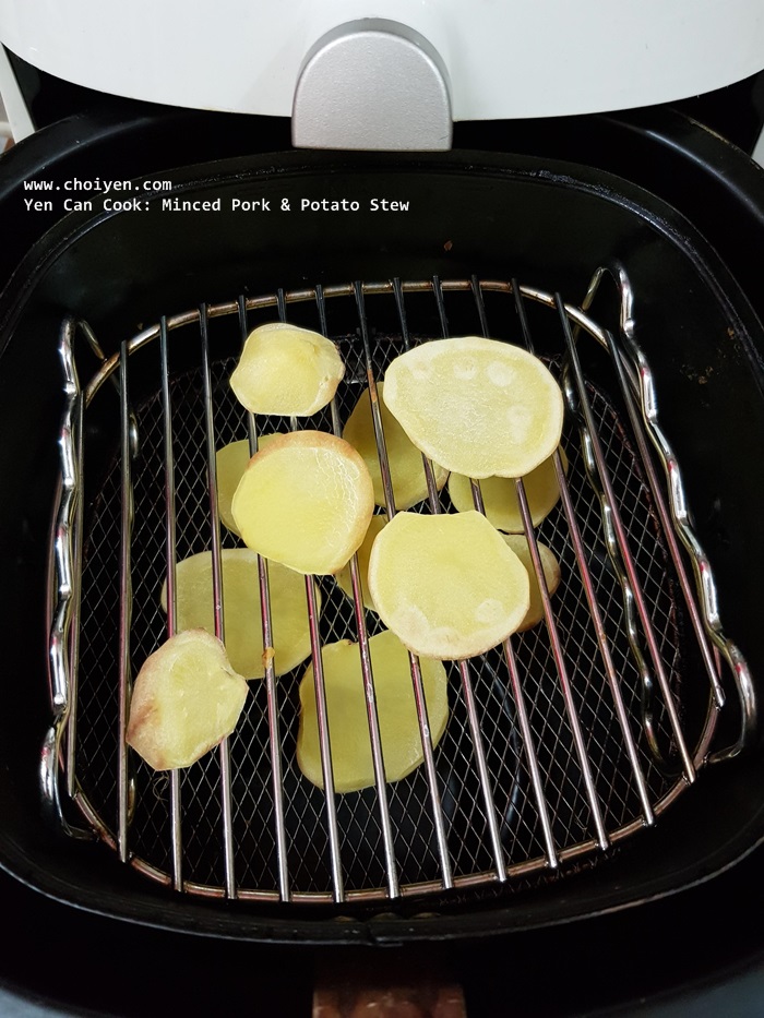 Step 1: Peel the potato and slice into ¼-inch thick slices. Dry both sides of the potato slices thoroughly with paper towel.