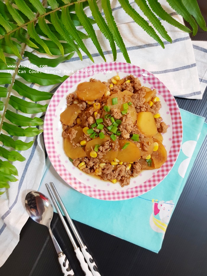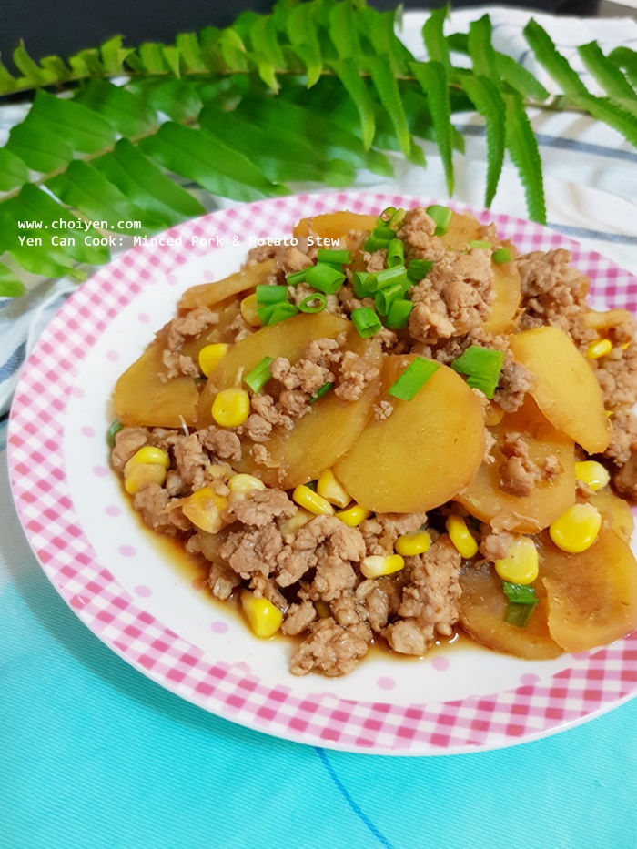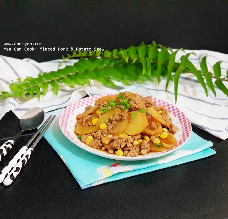 Step 5: Add in the potato slices and corn, as well as oyster sauce, sugar and water. Stir to coat all the ingredients. Cover with lid and simmer, stirring occasionally, for 10-15 minutes (depending on the size of potato or carrot if you add any). Add a bit of hot water if the sauce runs dry before the potato and carrot turn tender.