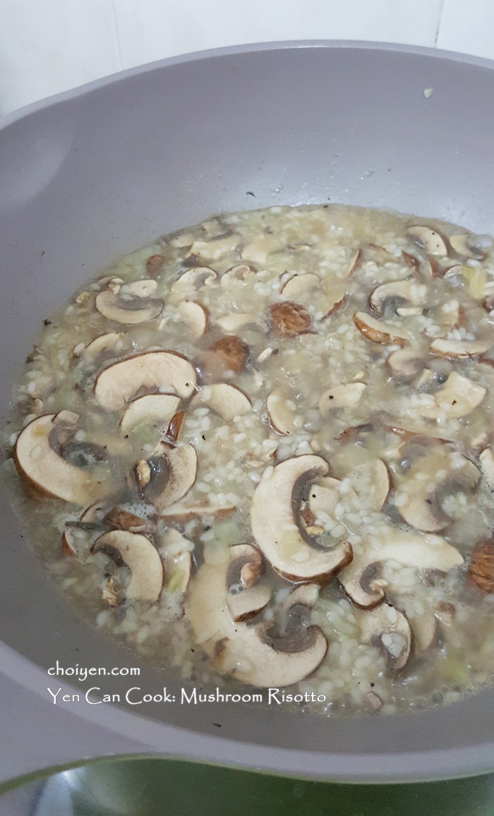 Step 5: Add in the mushroom and continue to stir until the rice has absorbed all the liquid. When the rice appears almost dry, add another ladle of stock and repeat the process. It’s important to stir constantly.