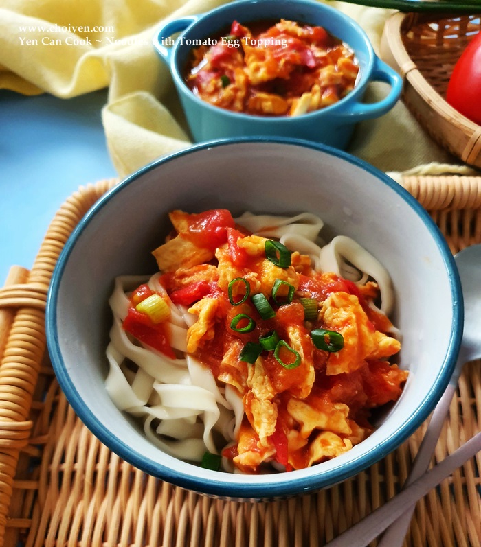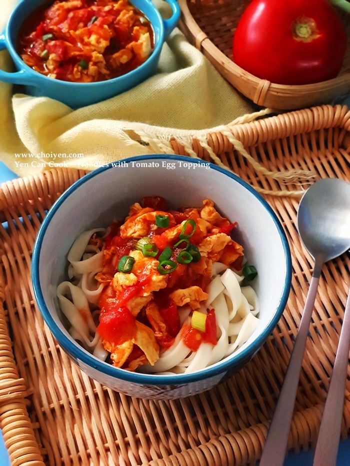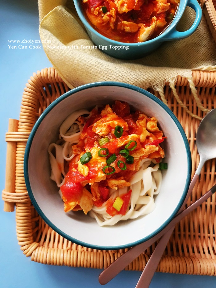 Step 5: Turn off the fire and ladle the tomato egg gravy onto the noodles (Step 2), garnished with chopped spring onion. Serve.