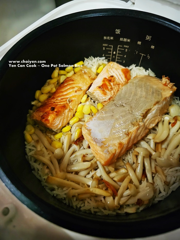 Step 5: Cook rice as usual and put the pan fried Salmon (Step 3), mushrooms (Step 4) and corn kernels atop of the rice when the remaining cooking time is 10 minutes. Once rice is cooked, use a spoon or chopsticks, break up the salmon while fluffing the rice to mix the ingredients well. Serve.