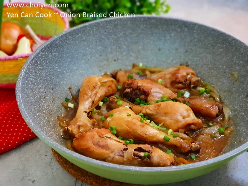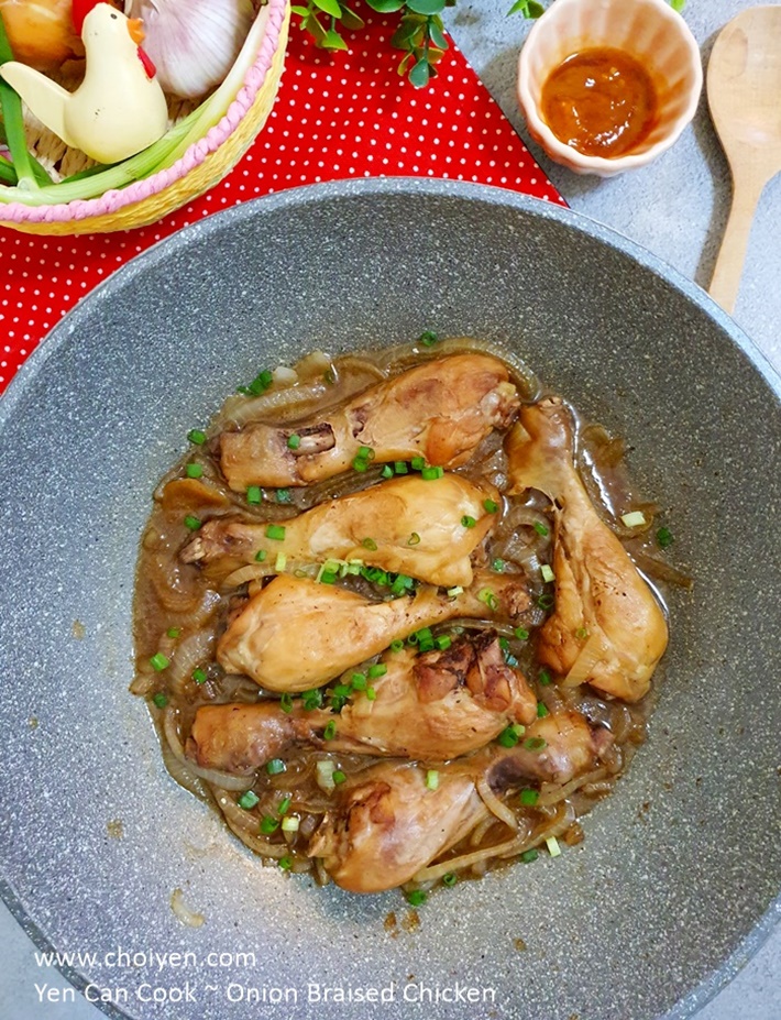 Step 3: In the same skillet, add in sliced onions, slightly stir fry for 1-2 minutes and spread evenly on the skillet. Lay the chicken drumsticks (Step 2) on the onion layer.
