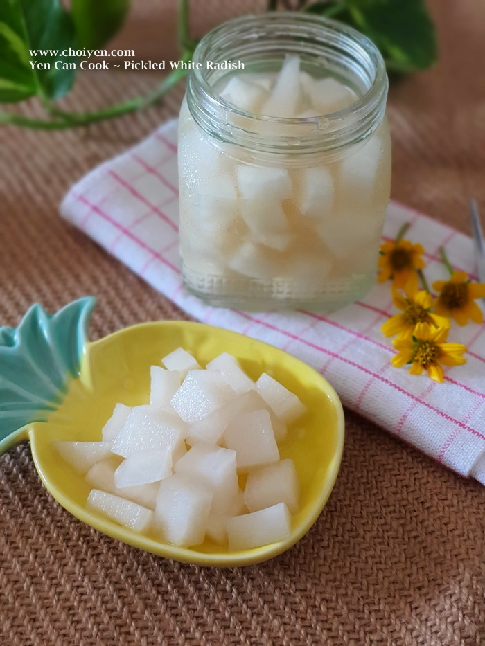 If you like Korean fried chicken, this pickled white radish certainly no stranger to you. Always served as condiment along with Korean fried chicken, the crunchy and vinegary diced white radishes act perfectly to cut through the meatiness and oiliness of the fried chicken. This side dish also well complement any other spicy or meaty dishes for a much needed refreshing note to the palate.