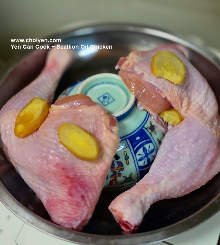 Step 2: Place an inverted bowl inside a large steaming plate. Arrange chicken legs surrounded the bowl and topped with ginger slices.