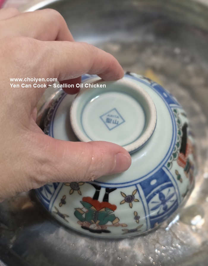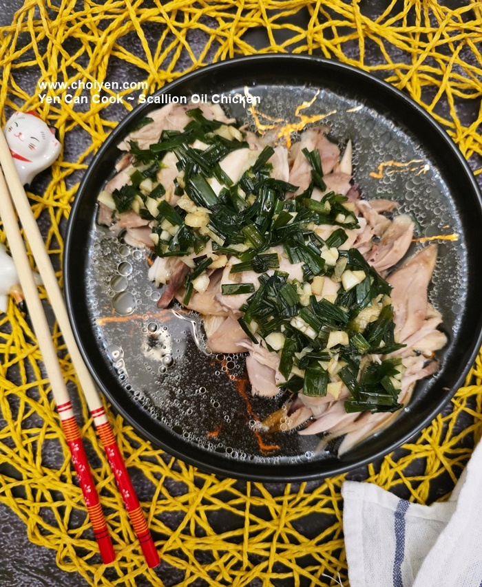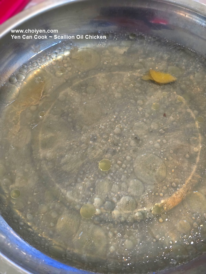 Step 3: Pour the reserved chicken juice (Step 5) into the scallion-garlic oil mixture.