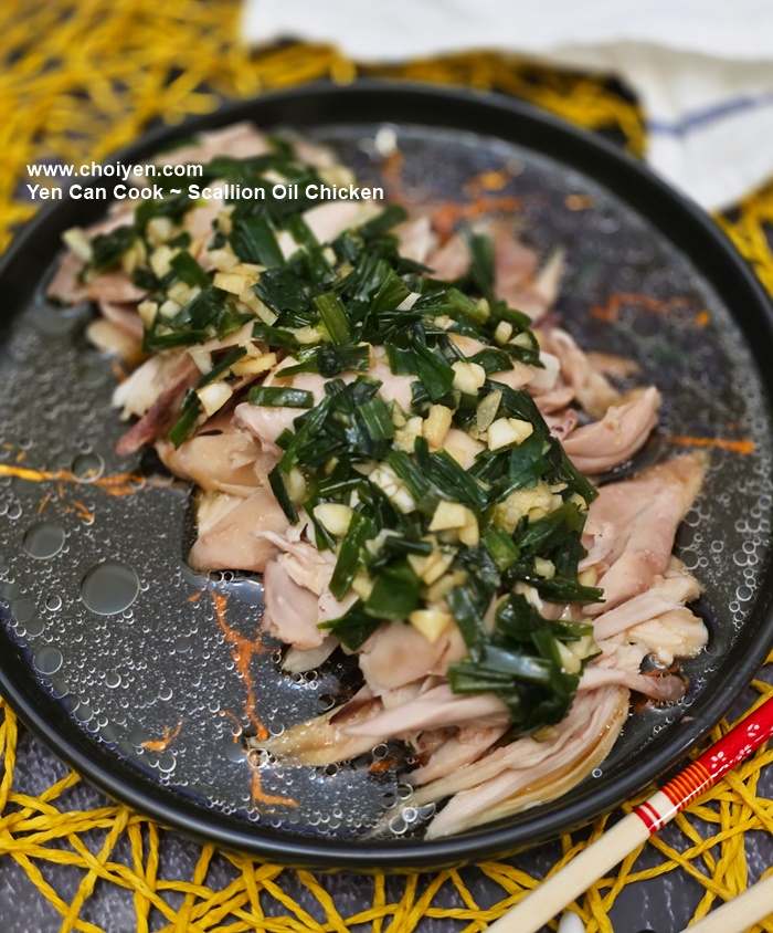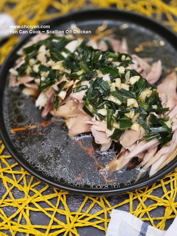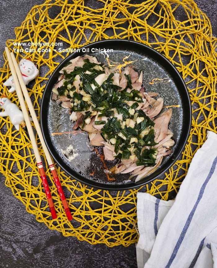 Step 7: 3. Spoon the scallion-garlic oil with chicken essence over the shredded chicken.