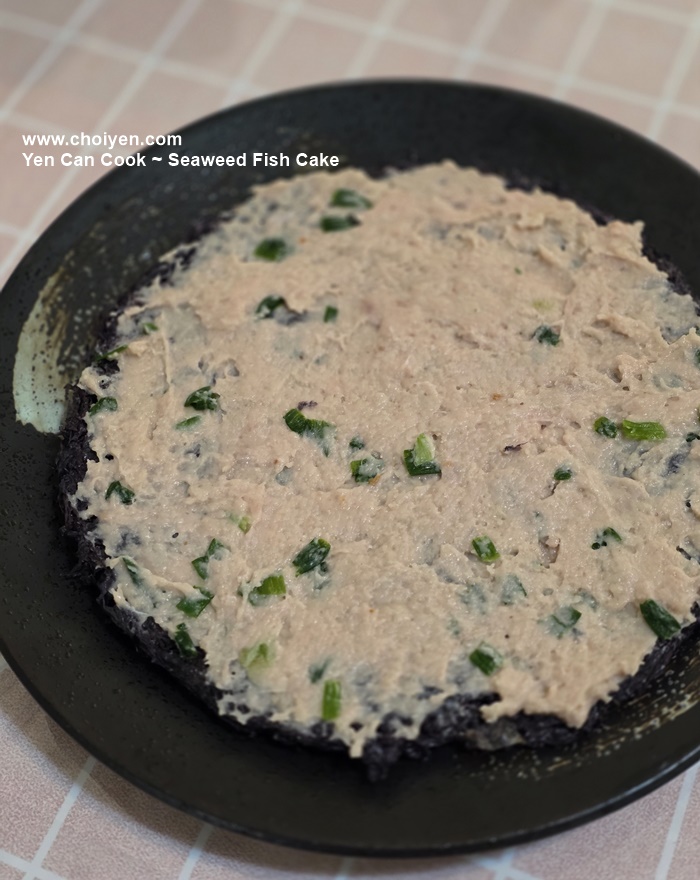 Step 2: Evenly spread the fish paste mixture (Step 1) over the entire surface of the seaweed.