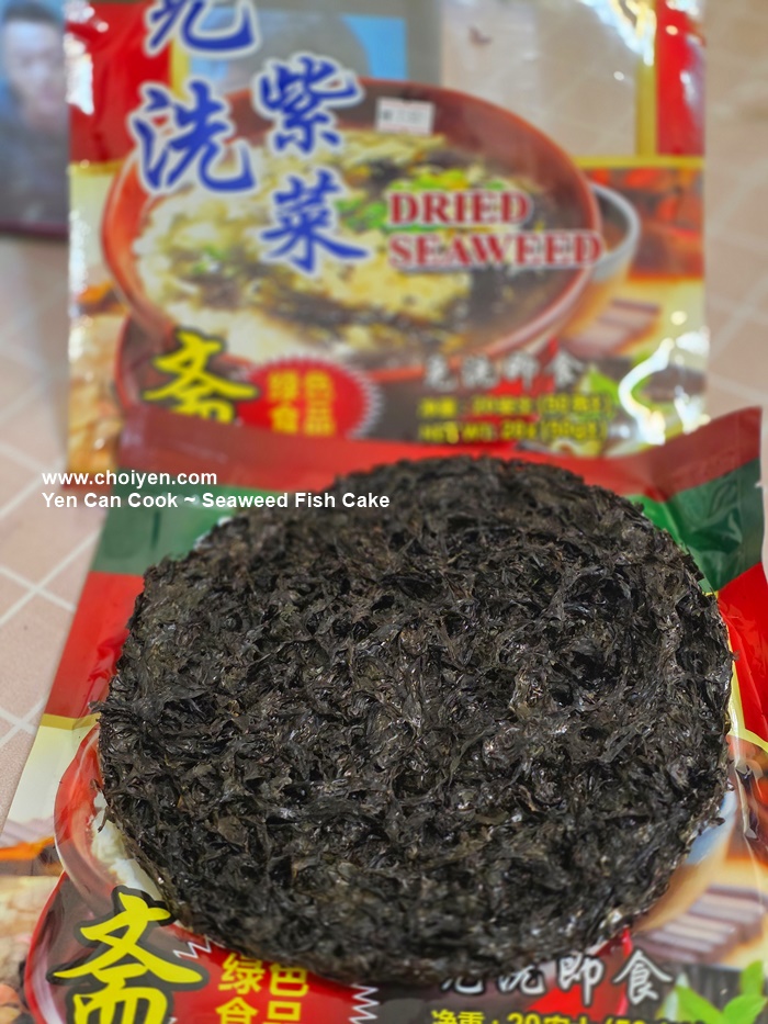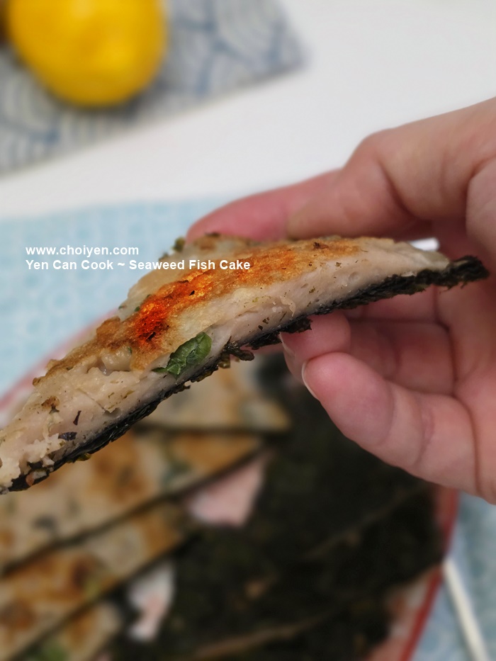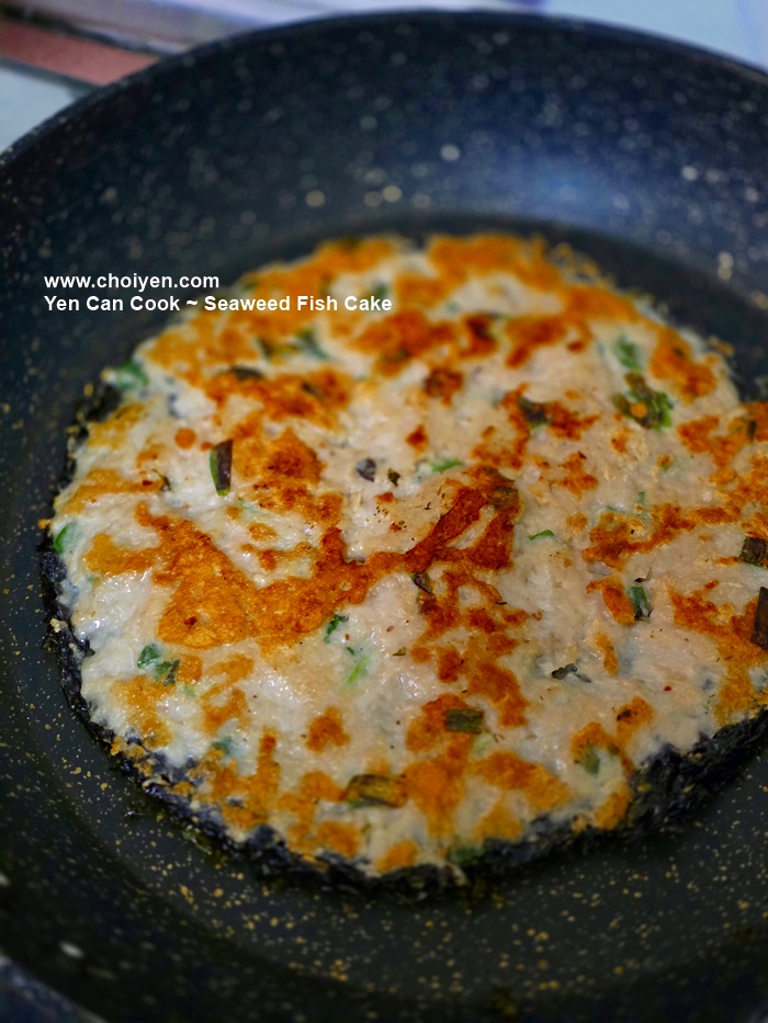 Step 3: Heat a pan over medium heat with cooking oil, put the seaweed-fish paste disc into the pan, fish paste side down. Pan-fry for 3–4 minutes until golden brown.