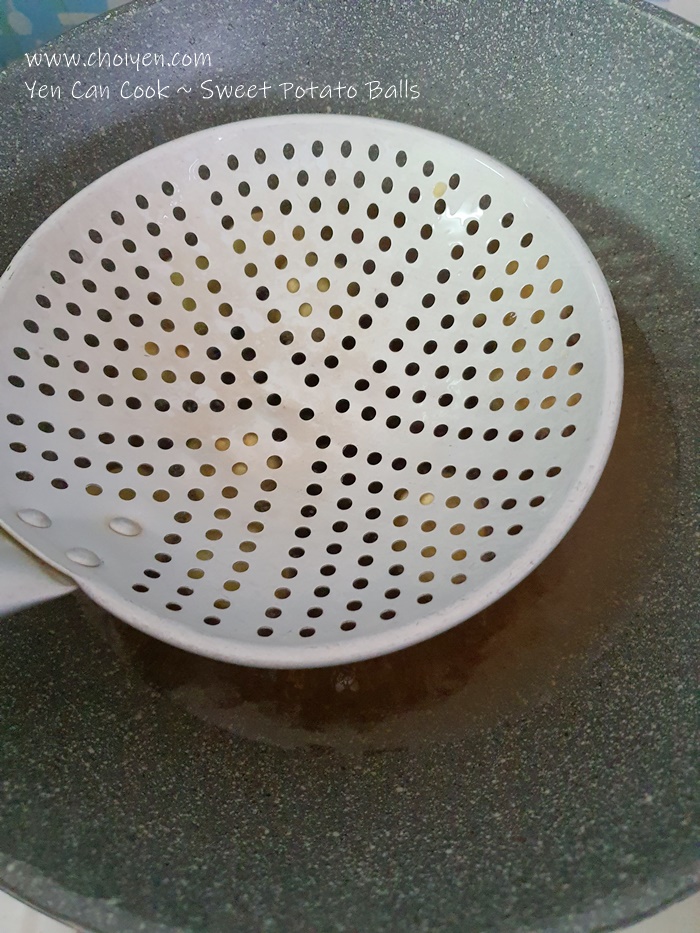 Step 4: Heat cooking oil in a deep pot and add in sweet potato balls, not too many in one go. Cook them over low heat and stir them with spatula constantly so they’ll cook evenly.