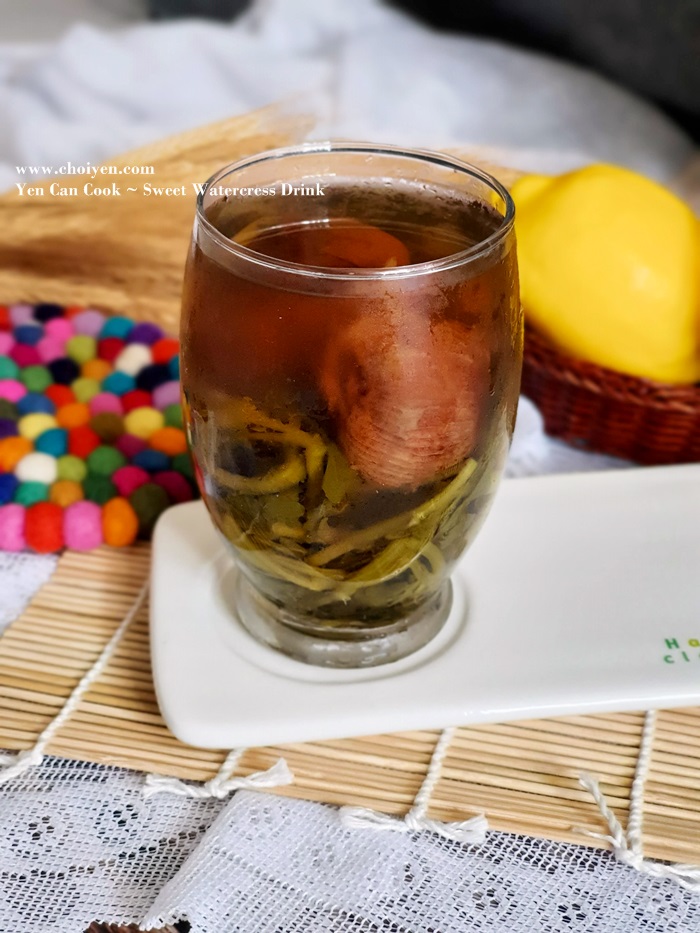 Today’s main ingredient is watercress which is normally used to make into savoury soup like THIS. But today’s recipe is a sweet version which I first had at a Kong Kong style Cha Chan Teng. Many of you might skeptical about the taste of this sweet watercress drink because this aquatic plant has a bitter and slightly peppery taste, will it taste good? Fret not, honey dates and rock sugar are added to sweeten the broth and minimize the bitterness. So it’s quite a delightful drink especially after being chilled.