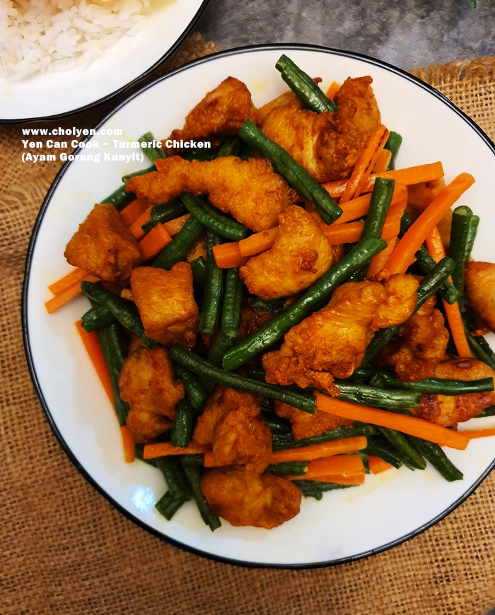 • Ooo, I like the sight of the oozy yolk fried egg at the side. I love ayam goreng kunyit and this dish is best eaten with rice and egg. By the way, have you tried Mat Rock’s version? (They have food trucks all over the place + delivery). We order quite frequently. Actually, you don’t have to remove the oil after deep frying the chicken pieces. I’ve seen Mat Rock (the workers lah) throw in the vegetables (when the chicken is almost done) to deep fry and everything gets scooped out together. Yes, this dish of ayam goreng kunyit wouldn’t be complete without the vegetables of long beans, carrots and onions (which you acknowledged that you forgot to buy…lol).