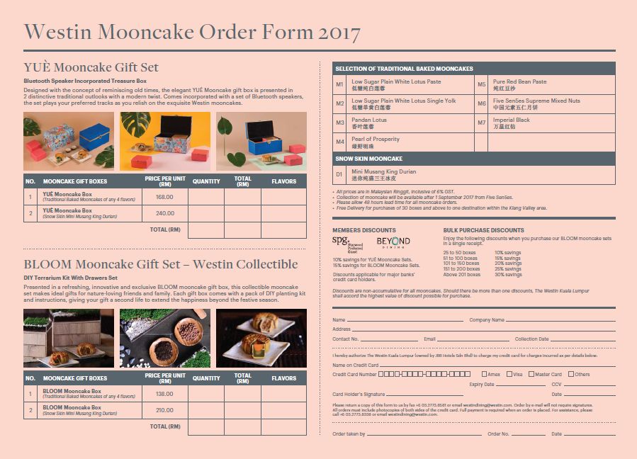 ~ Starwood Preferred Guests (SPG) and Beyond Dining members receive 10% discount for YUÈ Mooncake gift box and 15% for Westin Collectibles BLOOM Mooncake gift box during the promotional period.